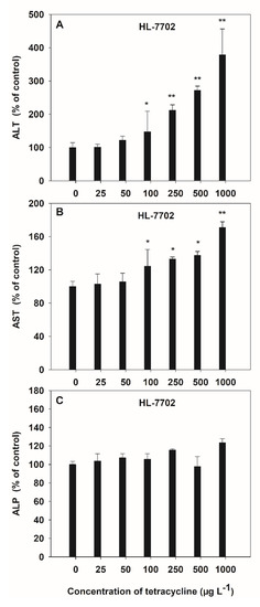 Alanine transaminase, AST and ALP are three liver enzymes damaged by antibiotics and can represent liver function in humans. The toxicity of HL-7702 cells exposed to TC was observed by the activities of ALT and AST, which increased in a dose-dependent manner, and the average increases were 1.05-fold and 0.29-fold over the control values, respectively (Figure 3A,B). However, no significant variation was observed in ALP activity induced by TC (Figure 3C). The activities of ALT and AST were varied at the low dose (100 μg L−1) of TC, while the AST activities were similar for 500 μg L−1 and 1000 μg L−1 of TC. The maximum increase in the activities of ALT (3.78 folds) and AST (1.71 folds) due to TC was observed at 1000 μg L−1 as compared to control.