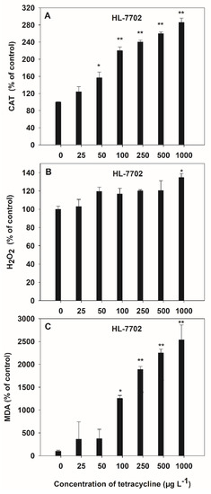 Effect of TC on the activities of CAT (A), H2O2 (B) and MDA (C) contents in HL-7702 cells after 4-h incubation. Data are given as mean ± S.E. (n = 3); “*” and “**” indicate significant (p < 0.05) and highly significant (p < 0.01) differences between controls and treatments, respectively.