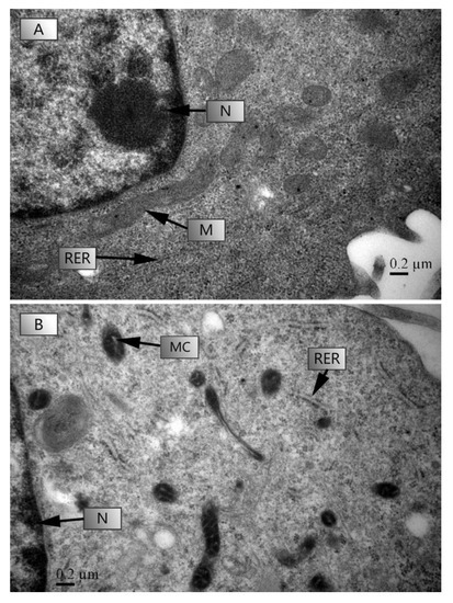 The TEM microscopic photographs of HL-7702 cells under a control (0 μg L−1) and 1000 μg L−1 stress are shown in Figure 5. After 4 h of culture, TC-induced ultrastructural damage of HL-7702 cells was indicated by changes on the rough endoplasmic reticulum (RER) and mitochondrial cristae (MC) (Figure 5B). HL-7702 cells showed swelling in MC and RER and a loss in the ribosomes in RER at 1000 μg L−1 of TC (Figure 5B).