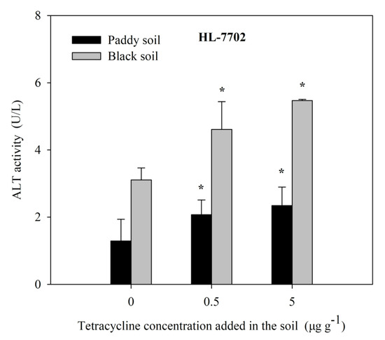 The effects of soil TC on the ALT activity in HL-7707 cells. Data are given as mean ± S.E. (n = 3); “*” indicate significant (p < 0.05) differences between controls (0 μg L−1 TC) and treatments.