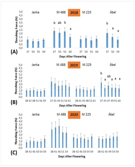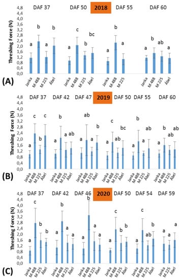 The differences of mean threshing force (N) values among the four rice varieties (Szarvas, Hungary, 2018—(A), 2019—(B), 2020—(C)). The different letters mean significant differences among the varieties at probability level 0.05.