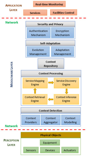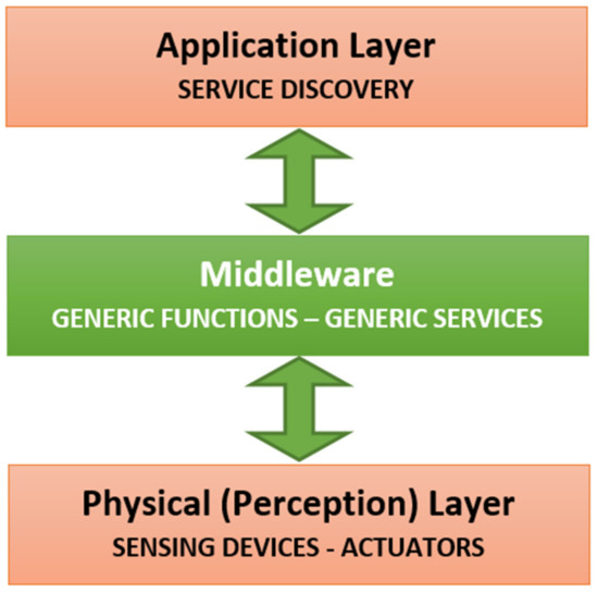 Middleware, which can be defined as a software that enhances interoperability among incompatible devices and applications, may provide fundamental—as well as multidisciplinary—functions and services such as data management, access control, and service discovery [50]. In a basic layered IoT architecture approach as shown in Figure 1, the middleware acts as an interface between the physical devices (low level) and the applications (high level).