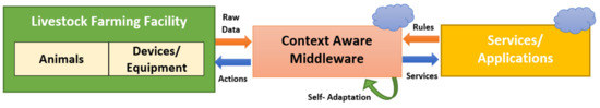 The functionalities required by the proposed IoT middleware are primarily defined by the need of processing and managing the voluminous and heterogeneous amounts of data that are generated in the complex livestock farming environments in order to achieve the effective interconnection of smart devices involved in it. Context awareness—which refers to the property of a system to be constantly aware of its current state both in the physical and virtual environment—has been proven to be a substantial asset of the IoT [93,94], enabling exactly these desired functionalities. Additionally, by properly integrating a semantic ontology model [95] in the context-aware middleware, the proficiency, flexibility, and scalability of the entire IFM system are expected to be ensured. Furthermore, the proposed IoT middleware aims to add to the system’s robustness by encompassing the Infrastructure as a Service (IaaS) properties of cloud computing for reserving the required computational power and storage capacity. A more detailed analysis of the IoT middleware design, as depicted earlier in Figure 4, can be found in the following subsections.