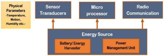 In the event of consolidating the IoT into typical IFM systems, wireless technologies are considered as the most important feature to enable real-time intelligent interactions between animals and multiple embedded devices with or without human mediation [76,88]. To this end, the lower level represents the perception layer which involves a WSAN integrated in a livestock facility. The WSAN consists of groups of self-powered nodes deployed in a mesh network topology as in [89] with sufficient communication range for long-distance operation [48], as well as data rate and power consumption. These nodes are equipped with sensors (such as wearable sensing and biometric devices) that remotely collect real-time data on various parameters related to the animals’ physiology and behavior [90,91,92], as well as to the livestock facility in general. Additionally, the WSAN involves actuators that interact with the farm machinery and devices, enabling the corresponding physical actions. Regarding the hardware architecture of the wireless nodes, different solutions have been presented, specifically designed for the harsh operating environment in rural areas. The block diagram of a typical WSAN node for the livestock industry is shown in Figure 5.