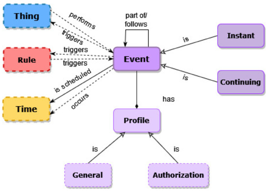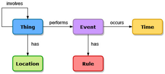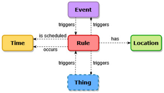 The five core ontologies are associated with relations, according to which each single instance represents the monitoring of a unique situation that describes an event involving a thing and occurring at specified location and time. The event is identified or triggered based on one or more rules. The proposed ontology-based context modeling structure is developed in the form of the Web Ontology Language (OWL) 2.0 [105] while it can be implemented in extensible markup language (XML) which is a platform-independent and resilient tool, suitable for use in different phases of information representation as well as for communication based on the simple object access protocol (SOAP). The five core ontologies, along with their associations, are demonstrated in Figure 6 and are described comprehensively in the following subsections.