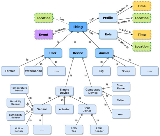 The thing ontology constitutes the core of the context model, since this is the major building block of the IoT. Since, a ‘thing’ can be either a user, an object (in this case an animal), or a device, it is modeled by three subclasses which are defined by a number of static properties, while each ‘thing’ subclass may have children subclasses for further categorization.