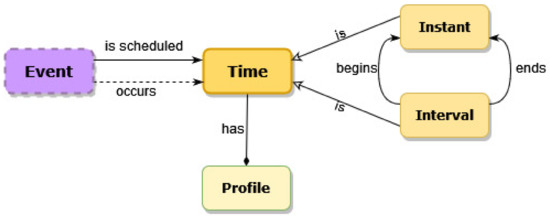 The time context is employed to define the temporal occurrences of an event that need to be timestamped, thus in order to model the corresponding properties, a time ontology is required to be developed as shown in Figure 9.