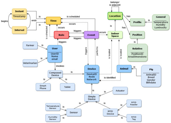 Among the various existing modeling techniques that can be found in literature, the semantic ontology approach is the most effective in terms of formality, interoperability, and reusability [101], focusing on a generic model design which can assist the composition of context aware services for smart livestock management. Taking into account that the modeling structure should represent—in the best possible way—not only the conceptual data correlation to a situation but also the data generation circumstances and their variability, a synthesis of three widely accepted context categorization approaches is applied, that is the “5 Ws and H” as in [102] along with event driven representation as in [103] and an operational schema as in [104]. According to this, context is described by five core parent ontologies that may have attributes describing their basic properties. In addition, entities are included as part of the parent ontologies, while they may also have some other children entities to describe them.