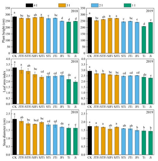 The results for the plant height, LAI, and stem diameter of summer maize under different irrigation treatments are shown in Figure 1. The changes in the plant height, LAI, and stem diameter under different irrigation treatments were basically the same for the two growing seasons. For the irrigation treatments that were applied in three growth stages, the plant height in the JTFi group and the LAI in the SJTi group decreased the most significantly, whereas in the SJFi group, the steam diameter decreased the most. For the irrigation treatments that were applied in two growth stages, the plant height and stem diameter decreased the most significantly in the JFi group (by approximately 12.8% and 18.4%, respectively), whereas no significant differences were determined between the two-irrigation application treatments in terms of LAI. In the single-irrigation treatments, the plant height in the Ti group was significantly lower than that of the two-irrigation application treatments, with the average decreasing by 19.9% compared to CK (p < 0.05). The LAI of Ji was significantly lower than it was in the two- and three-irrigation application treatments, with an average decrease of 30.3% being observed compared to CK (p < 0.05), whereas no significant differences were observed between the two-irrigation application treatments in terms of stem diameter. In conclusion, a water deficit at the seedling and jointing stages significantly affected the plant height in summer maize, and continuous deficit at the seedling and jointing stages had the greatest impact on the growth in summer maize, whereas a water deficit at late growth stages had a greater impact on LAI.