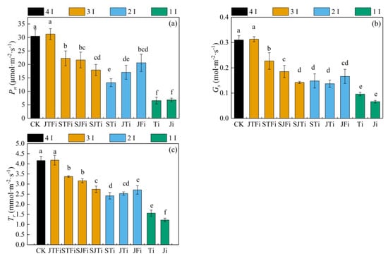 The Pn, Gs, and Tr of summer maize leaves decreased as the irrigation frequency decreased (Figure 2). Compared to CK, the JTFi treatment had no significant effect on the photosynthesis of summer maize leaves, whereas the Pn, Gs, and Tr of the summer maize leaves from the STFi, SJFi, and SJTi groups significantly decreased and continued to increase as the water deficit stage continued. The Pn, Gs, and Tr of the STi and JTi groups were significantly lower than those of the STFi and JTFi treatment groups, whereas the Pn and Gs of the JFi group were not significant compared to the SJFi group, and the Tr of the STi group was significantly lower than it was in the SJFi group. The Pn, Gs, and Tr of the Ti and Ji groups were significantly lower than those of the two- and three-irrigation application treatments, and the Tr of the Ji treatment group was significantly lower than that in the Ti treatment group. Obviously, a water deficit at the filling stage seriously affects photosynthesis during this stage and further affects filling.