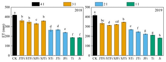 The water consumption (ET) of different irrigation treatments decreased as the irrigation frequency decreased (Figure 3). For the irrigation treatments that were applied in three growth stages, STFi and SJFi decreased the most, with the average decrease being 21.0% and 22.0%, respectively (p < 0.05). For the irrigation treatments that were applied in two growth stages, JFi was lower than the others, with the average decrease being 44.8% (p < 0.05). In the single irrigation treatments, the ET for Ji decreased by 56.0% (p < 0.05) on average.