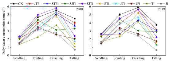 Due to the differences in the irrigation frequency among the various irrigation treatments, the daily water consumption of the different treatments at different growth stages was different (Figure 4). The daily water consumption in the JTFi, JTi, JFi, Ti, and Ji treatment groups with a water deficit at the seedling stage was lower than that of the CK treatment group in 2018 and 2019. After irrigation during the jointing stage, the daily water consumption of the JTFi, JTi, and Ji treatment groups was still lower compared to that of the CK treatment; however, the daily water consumption was higher in the JTFi, JTi, and Ji treatment groups than it was in the STFi, STi, and Ti groups under water deficit conditions at the jointing stage. The daily water consumption of the SJFi, JFi, and Ji groups with a water deficit at the tasseling stage showed an obvious decrease, and the daily water consumption of the JFi and Ji treatment groups was the smallest in 2018 and 2019, whereas the daily water consumption of the STFi, STi, and Ti treatment groups at the tasseling stage increased after irrigation to relieve the water deficit at the jointing stage. The daily water consumption during the filling stage in the SJTi, STi, Ti, and Ji treatment groups under water deficit conditions during the filling stage was lower than that in CK, but the daily water consumption in the JFi treatment group was still lower than that of the SJTi treatment group after irrigation during filling treatment.