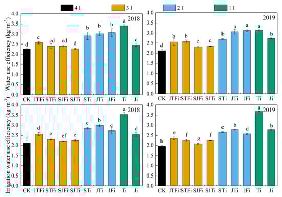Water use efficiency of summer maize under different irrigation treatments. (Note: the lowercase letters indicate the differences between treatments at the 0.05 level, and “4I, 3I, 2I, and 1I” indicate the number of irrigations).