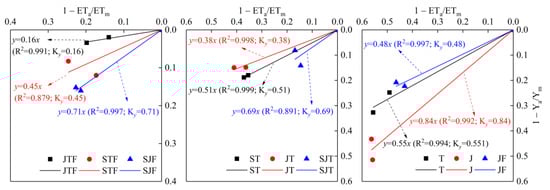 where Ya and ETa are the actual yield and water consumption for the different irrigation treatments (JTFi, STFi, etc.), respectively; Ym and ETm are the actual yield and water consumption for the control treatment (CK), respectively; and Ky is the yield response factor. In general, a larger Ky means that the crops are more sensitive to water stress during the crop growing period, and a smaller Ky means that crops have a higher tolerance to a water deficit [].
