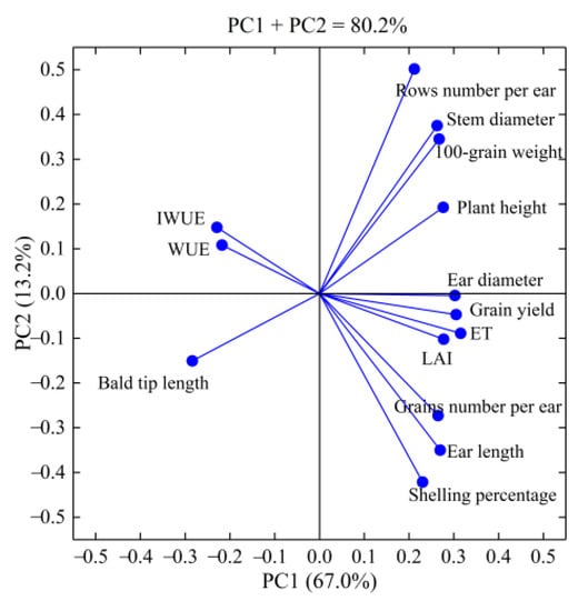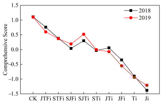 Principal component analysis (PCs) was used to extract all of the indexes, and the results are shown in Table 5. Three principal components were extracted. The eigenvalues (λ) of Principal Component 1 (PC1) was 9.38, explaining 67.0% of the total variance in the dataset; λ of PC2 was 1.85, explaining 13.2% of the total variance in the dataset; and λ of PC3 was 1.41, explaining 10.1% of the total variance in the dataset. The largest loading variable was ET, followed by grain yield, ear diameter, bald tip length, and LAI. This indicates that a water deficit in summer maize affects plant water absorption, limits plant growth, and leads to decreased grain yield (Figure 8). A comprehensive evaluation of each treatment through the two PCs was extracted by principal component analysis (Figure 9). As the irrigation frequency decreased, the comprehensive score decreased. In 2018 and 2019, the comprehensive score of the three-irrigation application treatment JTFi was the highest, whereas the score of the SJFi treatment was the lowest. The comprehensive scores of the STi and JTi in the two-irrigation application treatments were basically the same, whereas the score of the JFi treatment was the lowest, and the comprehensive score of Ti in the single-irrigation treatments was higher than that of the Ji treatment.