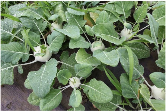 Kohlrabi (Brassica oleracea var. gongylodes) is a cool-season, biennial vegetable revered for its mildly sweet flavor and many health benefits. Kohlrabi is known by many names around the world and is cultivated as an annual crop in many parts of Europe, Asia, and North America. Like other cruciferous vegetables, kohlrabi is a potent source of essential nutrients and bioactive compounds produced by plant secondary metabolites [1,2]. The regular consumption of kohlrabi can aid in reducing the risk of chronic disease, depressive disorders, and many types of cancer [2,3,4,5].
