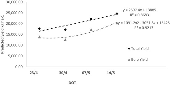The date of transplanting had significant effects on both the total yield and bulb yield of kohlrabi. However, leaf yield was not statistically significantly different among DOT. Bulb yield, and consequently total yield, increased with later transplanting. Kohlrabi transplanted on 14 May produced the highest bulb yields, equal to 20,297 kg ha−1 (Table 4 and Figure 2).