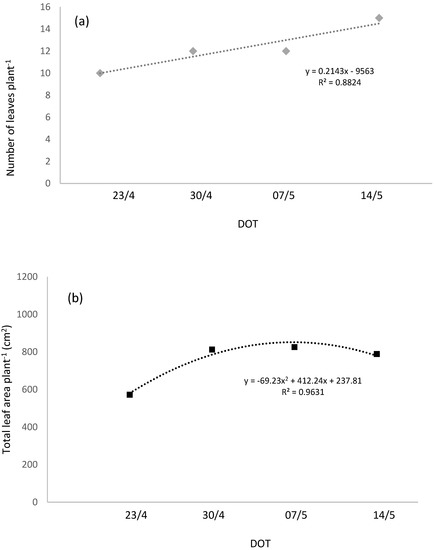 (a) Number of leaves and (b) total leaf area of kohlrabi influenced by date of transplanting; DOT = date of transplanting.