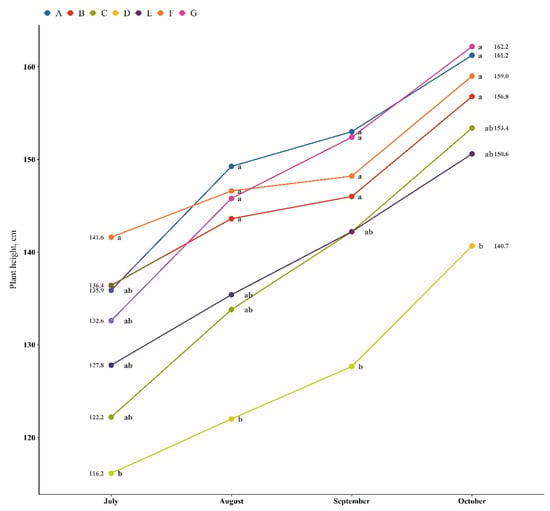 The growth dynamics of M. × giganteus in TEs-contaminated soil in the presence of PGPB isolates and their consortia are presented in Figure 1. The graph shows that the majority of isolates did not significantly affect plant height, except P. fluorescens KP-16 (D treatment), which had an inhibiting effect. In the presence of S. maltophilia KP-13 (B), the consortium of B. altitudinis KP-14 and Pseudomonas fluorescens KP-16 (F), and a consortium of all studied isolates (G), the dynamics of growth for the inoculated plants were similar to those of non-inoculated plants. When the plant was treated with a consortium of S. maltophilia KP-13 and B. altitudinis KP-14 (E), its growth was linear, with equal increases in height. Up to September, the same linear growth tendency was observed under treatment D (P. fluorescens KP-16); however, in October, the growth slightly increased (Figure 1).