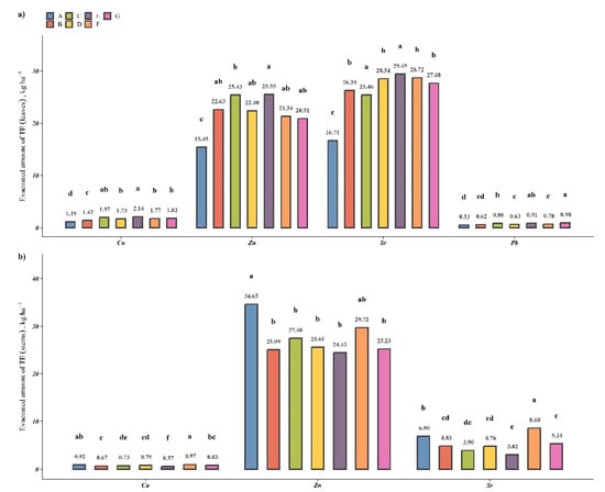 The accumulation of Zn and Mn showed a similar tendency in both stems and leaves, which was opposite to that of Cu and Sr accumulation in stems (Table S1). The accumulation of Cu, Zn, and Sr in stems significantly decreased in almost all treatments (by 14–27%, 17–31%, and 23–49%, respectively), except for treatments F and D (for Cu only) (Table S1). Conversely, Mn accumulation in stems significantly increased in treatment D (by 14%), while a slight but not significant decrease was observed for this element in treatments B and E (Table S1).