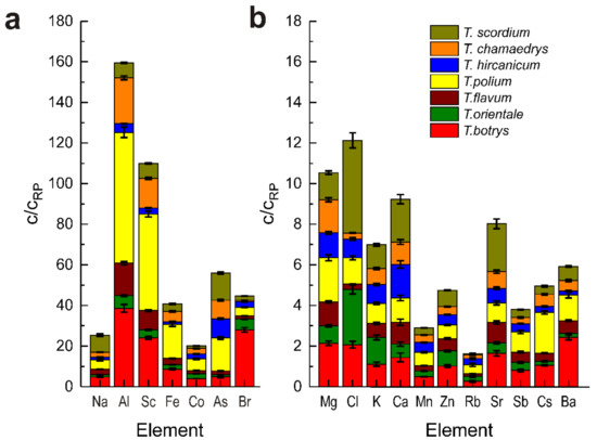 The stacked bar chart illustrates the distribution of mass fractions of all 18 elements determined in all analyzed plants; each taxon is normalized to the reference plant [39,40]: (a) elements with C/CRP > 20; (b) elements with C/CRP < 20.