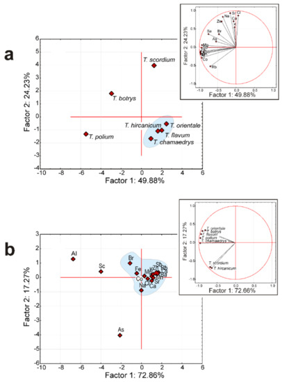 Accordingly, all Teucrium spp. formed four clusters; three of them—i.e., T. polium, T. botrys, and T. scordium—consisted of a single taxon, while the rest could be grouped in a single larger cluster (Figure 2a). This finding can be attributed to the presence of great amounts of Al, Sc, and As in T. polium, T. botrys, and T. scordium tissues. The distribution of the factor loading showed a dominance of Mg, Al, Sc, Mn, Fe, Co, Cs, and Sb in the first factor (PC1), while Na, Cl, K, Ca, Zn, and Sr seemed to be the main components of the second factor (PC2). The other elements—i.e., As, Br, Rb, and Ba—contributed to both factors. Given the great diversity of elements whose presence was evidenced in all taxa, we consider that in order to clarify the factor loading, it would be necessary to extend the present studies to more Teucrium species.