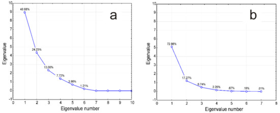 The scree plots reproduced in Figure 3a,b illustrate the difference between the Q and R modes concerning the contribution of the first three factors (PC) to the analysis.