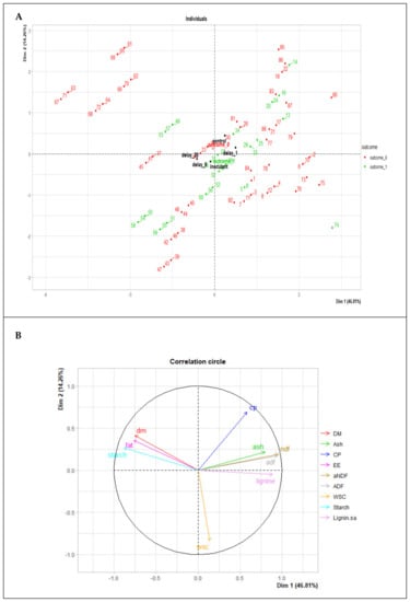 The ML approach is advantageous in analyzing “big data” composed of highly variable and sample numbers, which are, unfortunately, limited in this study. Nevertheless, we wanted to explore the relationship between qualitative and quantitative predictors and outcomes. At the MFA (Figure 2A), there was no segregation between the samples that performed or not performed the event, and the qualitative variables had no trend among the two factors. Consistently with the MFA, the quantitative variables grouped for DM, EE and starch, and in the opposite, grouped for ash, CP, ADF, and lignin (sa), while WSC stands alone (Figure 2B). This finding confirms the positive relation between DM and starch [32], and data from the previous study, except WSC, where the spatial distribution of quantitative variables was studied with a Principal Component Analysis [15]. In the current study, we found an anomalous trend for the ratio starch/WSC during the three experimental years. However, the WSC can be related to both the maturity stage of the plant and some external factors such as cool, cloudy weather at harvest, or rainfall during wilting [29].