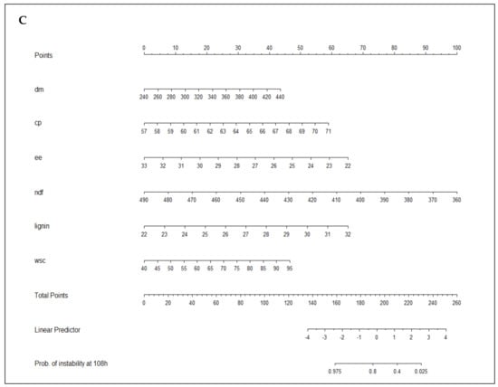 The Cox-univariate results are reported in Table S3 of the Supplementary Materials. The Cox-AIC, the Somer’s Dxy concordance index was 0.73, the Likelihood ratio test had p = 0.01, and the Schoenfeld residuals were graphically evaluated to ensure the proportional hazard assumption (global test had p = 0.17). The hazard ratios (HR) were 1.02, 1.34, 0.66, 0.65, 1.57, and 1.06 for DM, CP, EE, aNDF, lignin (sa), and WSC, respectively (p < 0.05, except for DM with p = 0.15). At the MFA, the first two latent variables, Dim-1 and Dim-2, explained 46.8 and 14.3% of the variability, respectively. DM, ash, EE, aNDF, ADF, lignin (sa), and starch had cos2 > 0.5 in Dim-1, while WSC showed cos2 > 0.5 in Dim-2. Ash, CP, aNDF, ADF, and lignin (sa) were grouped with a positive Dim-1, while DM, EE, and starch were grouped with a negative coordinate; WSC stood alone with Dim-1 close to zero. Along Dim-2, all traits showed positive values or close to zero, with the exception of WSC, showing a value of −0.83 (Figure 2A,B). At the nomogram (Figure 3A–C), the 95% C.I. risk for aerobic instability corresponded to a point range of 239–168 and 230–159 for 48 and 108 h, respectively.