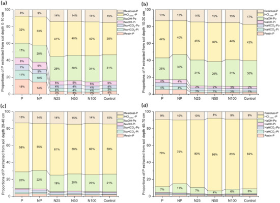 Proportions of P-extracted Hedley fractions from soil depth increments: (a) 0–10 cm; (b) 10–20 cm; (c) 20–40 cm; and (d) 40–70 cm.