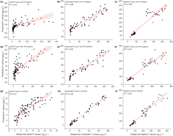 Comparisons of measured P pools (labile P: a,d,g; moderate P: b,e,h; stable P: c,f,i) and the predicted P contents (µg g−1) by NIRS modeling with P addition (a–c), NP addition (d–f), and control (g–i). Red lines indicate a significant correlation (all p < 0.05). Shaded areas represent 95% confidence intervals.