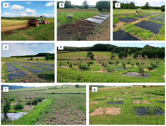 The experimental site at Ősagárd (a) Before setting up the microplots, manure was evenly spread on the green fallow in 2018; (b) Manure was raked into the frame of microplots to clear the path area in 2018; (c,d) Weed control fabric “islands” were laid on the manure rectangles in 2018; (e) The experimental site with the tomato plants with different pruning and mulching treatments in 2018; (f) The mulched microplots and grassy path on the left, tilled fallow before preparing seeding bed for alfalfa on the right in 2018; (g) Microplots after tomato planting but before setting up the stakes and trellises in 2019. On the upper right corner, alfalfa sown in the previous year is already visible with its 40–50 cm height.