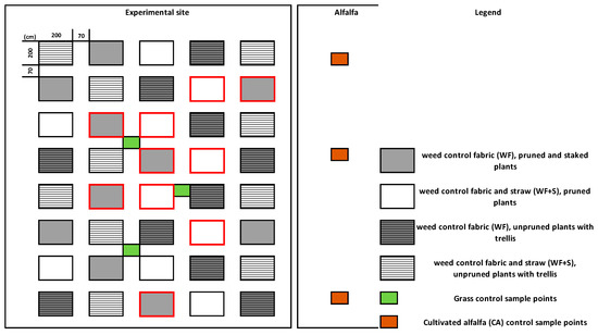 Experimental setup, the arrangement of microplots and sample points (Ősagárd, Hungary, 2018–2021). Microplots with red borders were sampled for soil parameters and for earthworms.