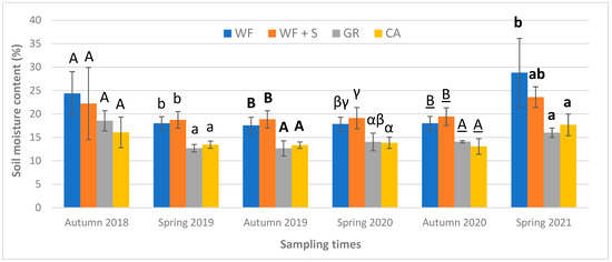 Soil moisture content between autumn of 2018 and spring of 2021. Same letters above bars mean no statistical difference. Results of each sampling times were analyzed separately from each other, so each set of results per sampling time was marked with a different type of letter. (WF: weed control fabric; WF + S: weed control fabric and straw; GR: grass vegetation; CA: cultivated alfalfa; Ősagárd, Hungary).