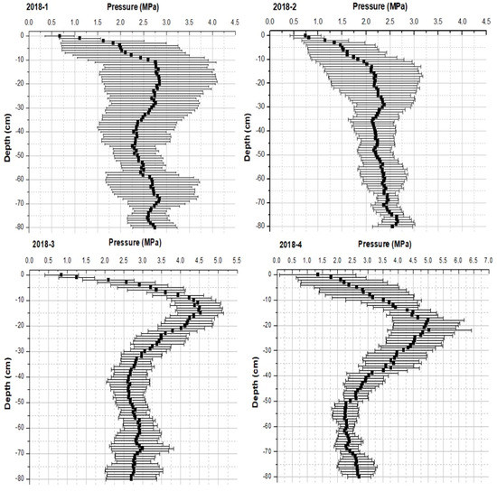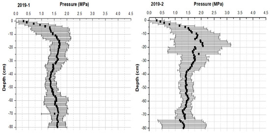 In 2019, we focused on the mulched areas (1 and 2) (Figure 5). Compared to previous years, even the highest SPR values were lower than 2 MPa, on average, throughout the 80 cm soil profile.