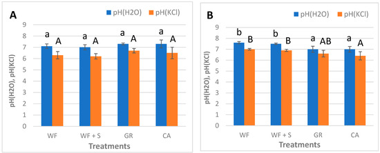 Initially, soil pH(H2O) values were between 7.0 and 7.3, while pH(KCl) values were between 6.2 and 6.7 (Figure 6). Regarding average pH values, none of the future treatment areas were statistically different from any other before the experiment started (Figure 6A). Measurements in January 2022 revealed that pH(H2O) values were between 7.0 and 7.6, while pH(KCl) values were between 6.4 and 7.0, on average. There was a slight pH increase with WF and WF + S treatments, while a little decrease was detected with GR and CA treatments. More specifically, as for pH(H2O), WF and WF + S treatments were significantly higher than GR and CA treatments, while for pH(KCl), WF and WF + S were significantly higher than CA plots.