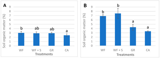 Initial soil organic matter (SOM) values were between 2.4 (CA) and 3.0% (WF) in 2018 (Figure 7A). By the end of the experiment, January 2022, SOM values increased in all treatments. SOM content was significantly higher with WF or WF + S when compared to GR and CA plots. In the case of WF, SOM content increased from 3.0 to 6.9, while with the combination (WF + S), the increment was larger: from 2.9 to 7.5%. The rise in SOM content was less pronounced with GR (4.3%) and CA (3.4%) treatments.