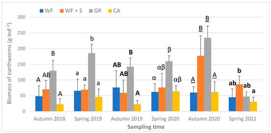 There were significant differences in earthworm biomass at all sampling times (Figure 9). It was the highest under the grass vegetation, except for spring 2021. In three sampling times (autumn 2018; spring 2019; autumn 2020), the values for GR were significantly greater than those of WF + S and CA.
