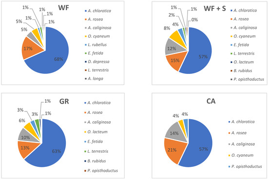 The most abundant earthworm species was Allolobophora chlorotica, dominating the list of species regardless of sampling time or treatments. Its proportion was the highest under WF (68%), followed by GR (63%), and 57% in case of both WF + S and CA. The second most dominant species was Aporrectodea rosea (17% for WF; 15% for WF + S; 13% for GR; 21% for CA). The third was Aporrectodea caliginosa (5% for WF; 12% for WF + S; 10% for GR; 14% for CA). Other earthworm species were only present at a maximum of 6% (Figure 10).