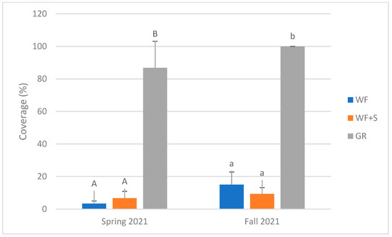 Effect of habitat and season on plant vegetation (total cover). Same letters above bars mean no statistical difference. (WF: weed control fabric; WF + S: weed control fabric and straw; GR: grass vegetation; Ősagárd, Hungary).