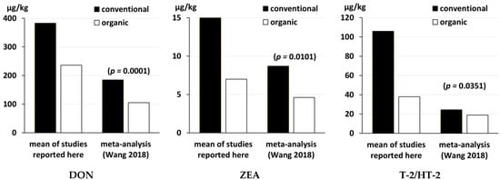 Results for DON, ZEA, and T-2/HT-2 from our analysis of data from field experiments and farm surveys are consistent with, and confirm, the results of a recent systematic review and meta-analysis of comparative (organic versus conventional) cereal grain and product composition data from all types of studies (controlled field experiment, farm survey, and retail survey) [46] (Figure 1), and an extensive retail survey which compared Fusarium mycotoxin contamination levels in common and spelt wheat flour brands available in Germany and the UK [50]. Specifically, both the unweighted and weighted meta-analysis found significantly lower (p < 0.0001) DON concentrations in organic cereal grain/products, and the unweighted meta-analysis (which allowed data from more studies to be included) also detected significantly lower concentrations of ZEA (p = 0.0101) and T-2/HT-2 (p = 0.0351) in organic cereal grain/products (Figure 1) [46]. Similarly, the wheat flour survey reported that DON concentrations were significantly lower (p = 0.0060) in organic wheat flour (49 ± 9 µg/kg dry weight) compared with conventional wheat flour (60 ± 6 µg/kg dry weight). Additionally, when whole-grain flour was compared, T-2/HT-2 concentrations were significantly lower (p < 0.05) in organic samples (1.46 ± 0.20 µg/kg dry weight) compared with conventional samples (2.74 ± 0.50 µg/kg dry weight) [50].