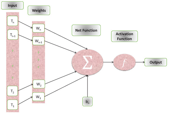 where the inputs are represented by , and represent biased vectors and connection weights, respectively. The Feed-forward neural network model uses a log-sigmoid as an activation function given as,