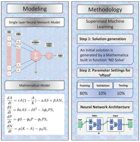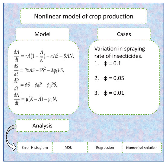 - Using artificial neural networks, a Levenberg–Marquardt technique (LMT) trains hidden neurons and validates the reference data set obtained using the “NDSolve” tool in Mathematica for different insecticide spraying rates instances.