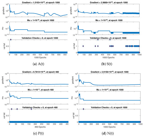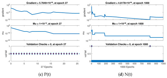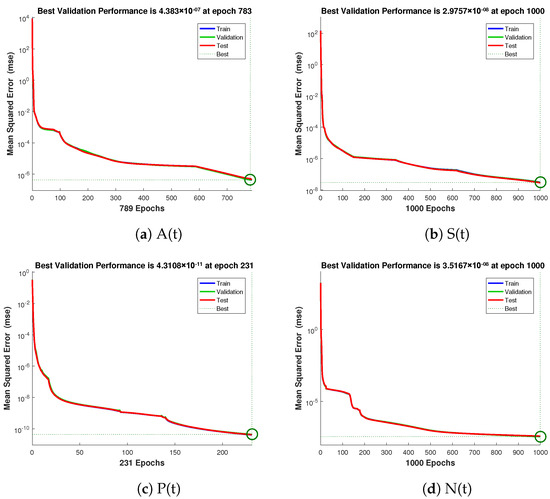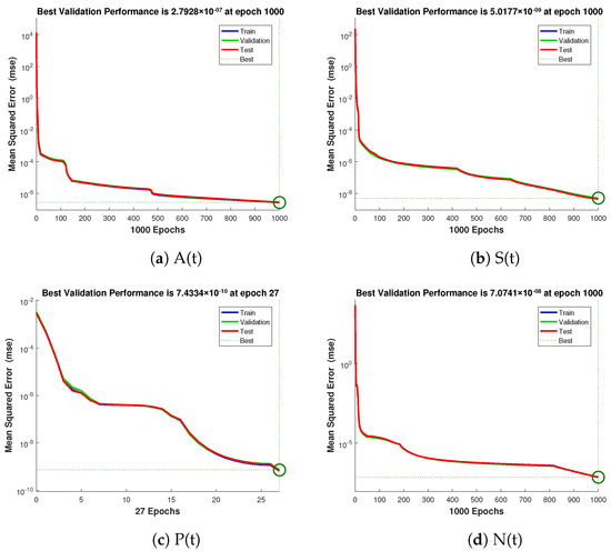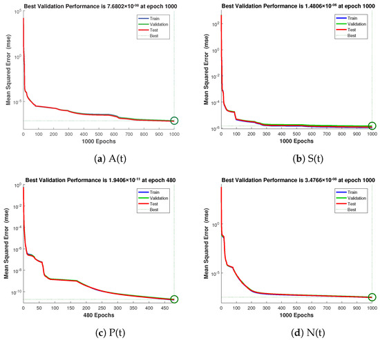 The numerical technique gives data set values that can be used to train, validate, and test data with 80%, 10%, and 10% probability. Each example’s mean square error (MSE) function convergence is shown graphically. Figure 4 shows the performance values for the case 1 which are in the range of , , and . Similarly Figure 5 and Figure 6 illustrate the performance values for case 2 and 3 respectively, which are in the range of , , , , , , and .