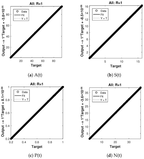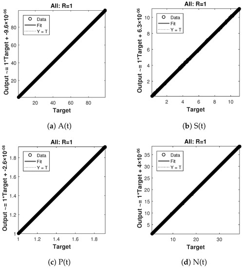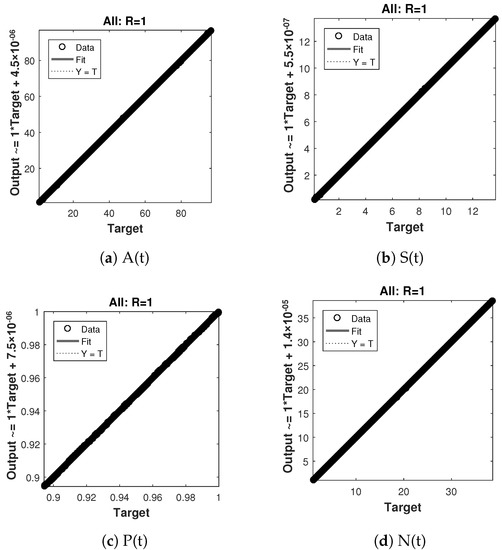 Approximate solution and targeted data fit together well and have the fewest absolute errors shown in the Figure 13, Figure 14 and Figure 15. The absolute error values of A(t) lie in the region of to , to and to ; for S(t) the values are in the range to , to and to . Similarly, for P(t) and N(t), the values are in between to , to , to , to , to and to .
