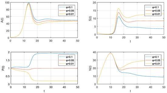 We did experiments in this section to see if the technique was correct and how the insecticide spraying rate affects a crop model. This model includes agricultural production, the concentration of insecticides, the density of insects, and the efforts. The cases are based on variation in the spraying rate of insecticides, i.e., the parameter. We consider the first case as [23]; to make the second and third cases, we slightly decrease the value of . Figure 3 illustrates the model and its different cases.