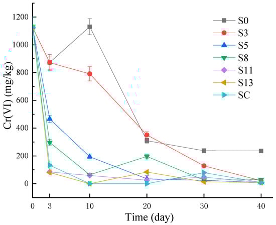 After chemical reduction by 2.15% CPS for 8 days, the concentration of Cr(VI) was increased to 1126.6 mg/kg, and much higher than adding CPS for 24 h (330.4 mg/kg). This indicated that Cr(III) was re-oxidized to Cr(VI) after a period of chemical reduction, which reflects the instability of chemical reduction. It is necessary to use biological method to further reduce and stable Cr. After CPS reduce and stable for 8 days, nutrient solution was added according to Table 2. The Cr(VI) concentration was monitored over the course of biostimulation (Figure 1). During the process, the concentration of Cr(VI) in each experimental group went down with time. In samples S0 and S3, the concentration of Cr(VI) declined slowly. The concentration in sample S0 increased to 1130.9 ± 57.7 mg/kg on the 10th day and then decreased until the 20th day, at which point it leveled off. Sample S0 showed signs of rebounding, demonstrating the instability of relying solely on the chemical reduction method. The concentration of Cr(VI) in other groups descended rapidly with time. The reduction rate of Cr(VI) in samples S11 and S13 on the third day was over 92.0% and closer to 90.0% in sample SC, which was lower than that of sample S13. While low temperatures have a certain inhibitory effect on microorganisms, the proportion of nutrient solution has even more influence. After remediation for 40 days, the degradation rate of Cr(VI) in sample S0 was 79.1%, and those of other groups were above 97.0%. These results showed that the nutrient solution promoted the growth of microorganisms, thus accelerating the reduction of Cr(VI). Furthermore, the higher the proportion of nutrient solution, the more obvious the degradation effect on Cr(VI). The temperature also had an impact on Cr(VI) reduction.