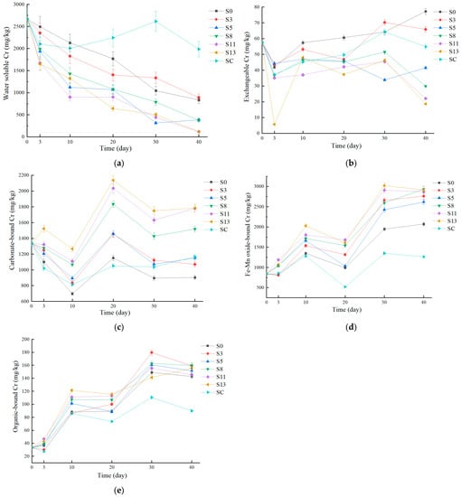 Concentration of Cr speciation in soils during remediation ((a) water-soluble fraction, (b) exchangeable fraction, (c) carbonate-bound fraction, (d) Fe-Mn oxide-bound, (e) organic matter-bound fraction.).