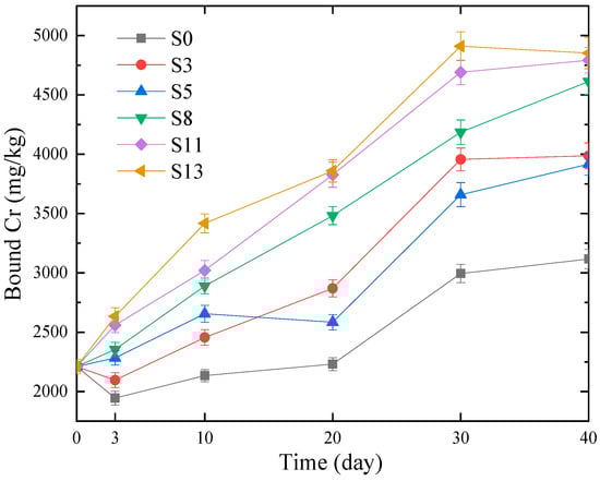 In the initial 20 d of remediation, the change rate of the bound fraction in groups with added nutrients decreased in the order of S13 > S11 > S8 > S3 > S5, and the rates in S11 and S13 exceeded 100 mg/(kg·d), while the rate order of the groups from 30~40 days was opposite to that of the first 20 days. In the 20~40-day period of remediation, the concentration of the bound fraction was arranged in the same order as the rate in the first half, which suggested that the rate of change in the first half is crucial to the stabilization of Cr in the soil. During the 30~40-day period, the concentration of the bound fraction was unchanged, and Cr in the soil was ultimately stabilized. The stabilization effects in S11 and S13 were approximately the same, and S11 and S13 increased by 116.9% and 119.6%, respectively, compared to the initial state.