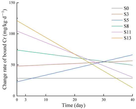 The rate of change of the bound fraction was positive in all groups (Figure 4), and the concentration of bound fraction generally increased over time (Figure 3). The rate of the bound fraction in the non-nutrient group S0 was constant (approximately 28 mg/(kg·d)). The rate in S3 and S5 increased with remediation time, while that of the other groups displayed a descending trend.